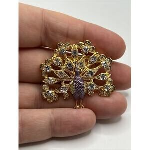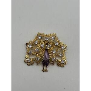 Rhinestone Peacock Lapel Pin Figural Brooch Gold Tone Luxury Pinback Button