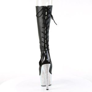 7" High Heel, 2 3/4" Platform Lace Up Back Knee Boot. Silver AB Rhinestones Bottom. Open Toe and Inner Side Zipper Closure. Vegan Black Faux Leather.