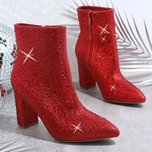 Rhinestone Pointy Toe Block Heel Ankle Boots