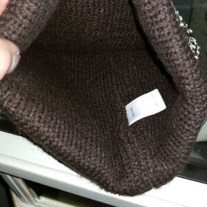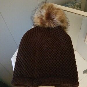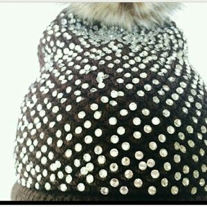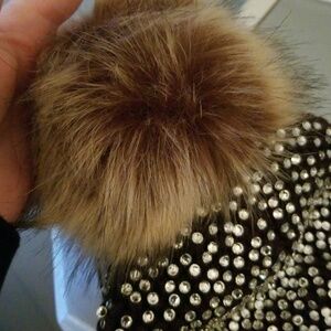 Brown knit beenie swirled with rhinestones. Faux fur pom makes this the hippest hat you'll own!