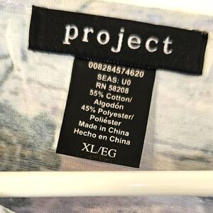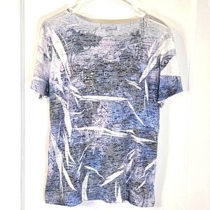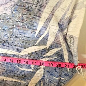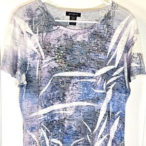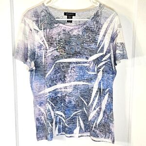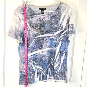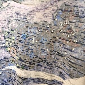 Stylish short sleeve shirt featuring a crew neckline, multiple colors & white rhinestone embellishments. Good condition, small discoloration on the inside collar that's not noticeable when wearing. Tag says XL but it's could also fit a large size.