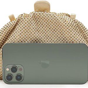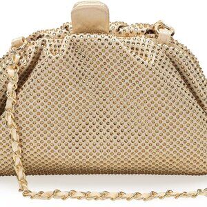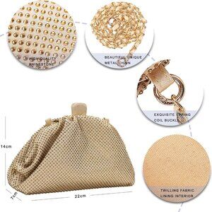 Features: Chic satin clutch with a ruched, slouchy silhouette and sparkling topaz-colored crystals. Comes with a detachable chain strap for versatile wear as a shoulder or crossbody bag. Compact enough for your phone, keys, and essentials, perfect for weddings, parties, or date nights.