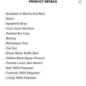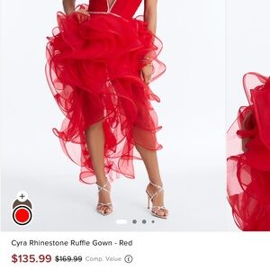 Make a statement with the Rhinestone Ruffle Gown in vibrant red. This stunning dress features intricate rhinestone detailing and dramatic ruffles, perfect for any special occasion.