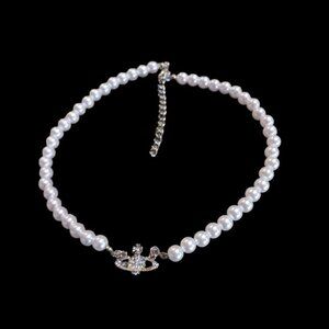 Elegant 17 inch faux pearl choker with a dazzling rhinestone Saturn pendant. Includes a 2 inch extender chain for adjustable length and extra charm. Perfect for celestial enthusiasts and stylish occasions.