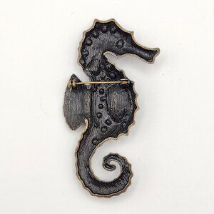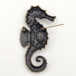 Large seahorse brooch/pin jewelry in antique gold tone metal with blue, purple and clear rhinestones.