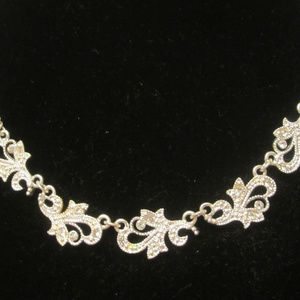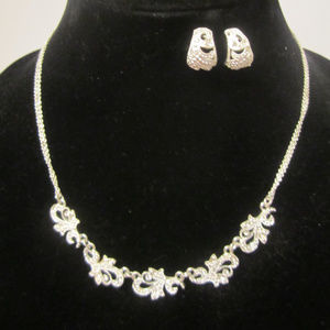 Here is a stunning set consisting of a delicate filigree silvertone necklace with delightful silvery swirls and filigree dots and details with small rhinestone accents. thin double chains on each side lend an elegant draped effect. The silvertone necklace can be adjusted from 16" to 19" or even longer I believe. Matching curved earrings feature the same filigree details and swirls with smll rhinestones on stud/posts. No markings. The display form is NOT included and is not for sale.