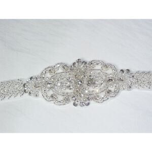 Romantic skinny rhinestone pearl crystal bridal belt. The belt is 28 inches long and 3/4 inch wide.. The closure is hook and eye plus clear plastic snaps.