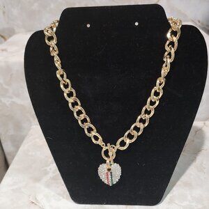 The necklace features a heart-shaped pendant adorned with sparkling crystals, arranged in a pattern that includes a central stripe of green, white, and red colors.