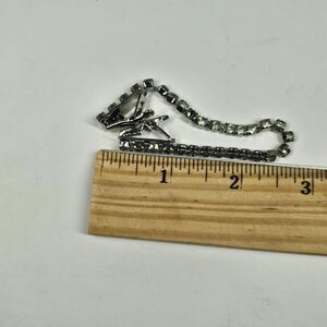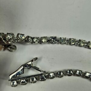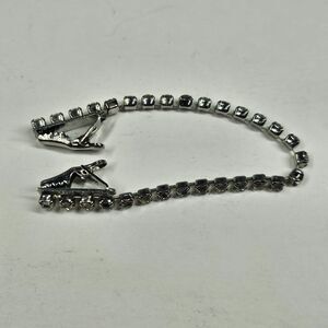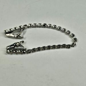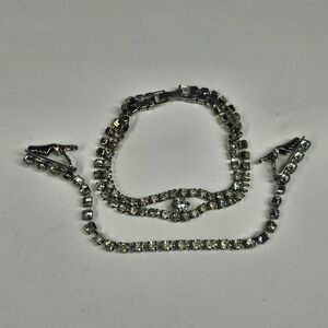 Pair of vintage rhinestone jewelry items. Both are clear rhinestones set into silvertone metal, but they are not a matching set, just two pieces that were found together. One is a sweater clip with alligator clips at both ends. The other is a bracelet. Neither is signed with a makers name. They are in good shape with minor surface wear from handling.