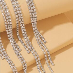 These stunning silver earrings feature a cascading waterfall design with multiple strands of sparkling rhinestones, perfect for adding a touch of elegance to any formal occasion.