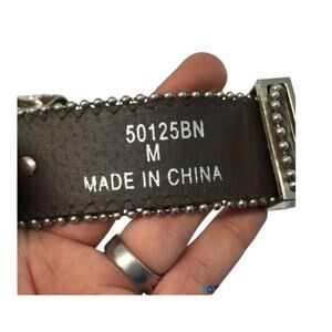 CONDITION: there are signs of wear and there are small loss strings and there are the other side of the belt have cracks and there is one rhinestone missing and there are two men made holes and there is a bolt missing for the part at holds the belt end
