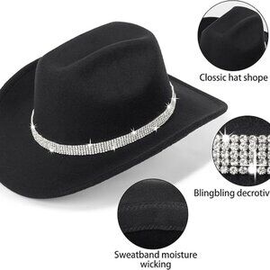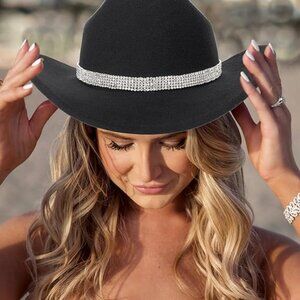 This black cowboy hat features a dazzling rhinestone band, adding sparkle and charm to your Western look.