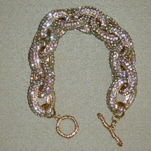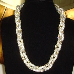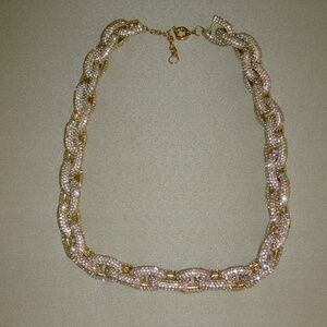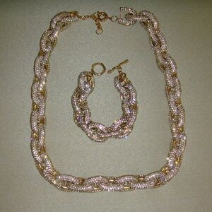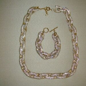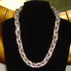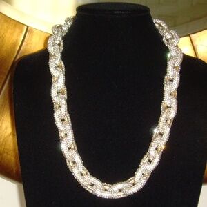 Rhinestone and Gold-Tone Chain Link Necklace - BLING! The gorgeous necklace measures 22 1/2 inches long with a 2 1/2 inch extender chain and jump ring closure. Each link measures approximately 1 1/2 inches long by 1 inch wide, it makes quite the statement. All of the rhinestones are bright and sparkly. I have pictured the matching bracelet for your info, but is it being sold separately. THIS LISTING IS FOR THE NECKLACE ONLY. Excellent condition and great quality.