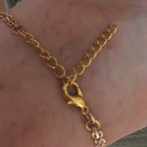 Rhinestone and enamel crusted infinity ankle bracelet. I wore the swimming and in the shower several times does not change color chain is gold plated brass heavy duty