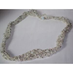 A splash of blush pink pearls along with white crystal and rhinestones adorn this belt. It is 37 inches long and 1 inch wide with a 1 1/2 inch center.