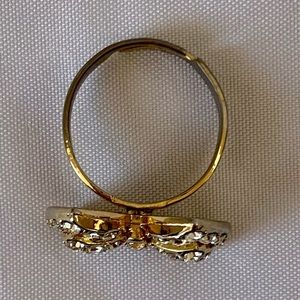 Adjustable ring with goldtone finish and pave style silver rhinestones. Some wear to finish on the underside- zoom photos for details. All rhinestones intact. Packaged to ship post-photos.