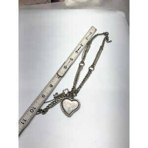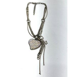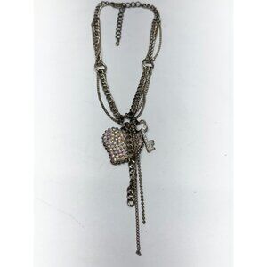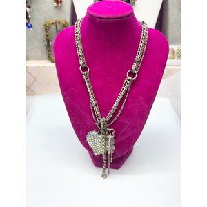 Rhinestone heart silver chain key charm necklace. Large rhinestone heart with hanging key and chains. Silver tone vintage necklace. MN53FH.