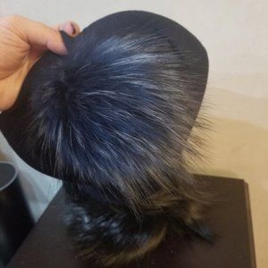 Navy hat with Real Raccoon pompom that can be removed for easy washing.