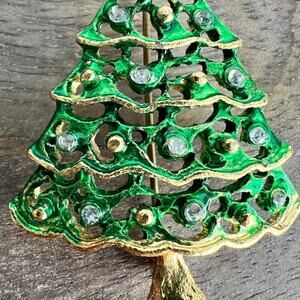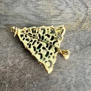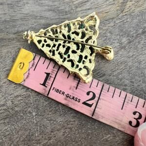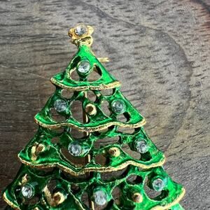 Rhinestone studded Christmas tree with ornament gold tone pin brooch