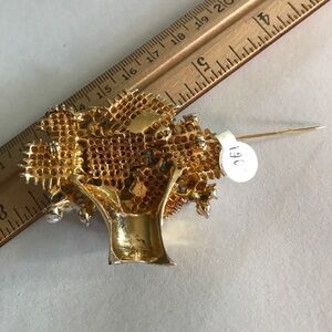 Beautiful sparkly pin! This is from a small boutique store with price still attached. Missing two stones on the top. Measures 2 inches tall and 2.5 inches wide.
