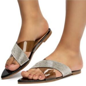 Details: Rhinestone slide sandals with cross straps. One smoke gray clear strap and one rhinestone strap. Pointy toe clear sandals.
