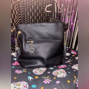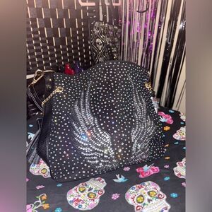 Embrace the darkness with our "Rebel's Requiem" handbag, where edgy meets elegance. This black beauty is adorned with a mesmerizing array of rhinestones, forming a striking pattern that's as bold as your personality. The gold chain strap adds a touch of luxury, while the black strap provides a sleek, versatile option. This bag is perfect for those who dare to be different. Make a statement with "Rebel's Requiem" – for the fearless, the fierce, and the unapologetic.