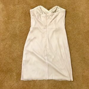 Taupe strapless dress, embroidered with sewn on jewels and rhinestones.
