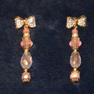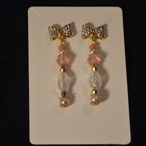 Rhinestones Bow Pink & White Beads Hanging Stud Earrings