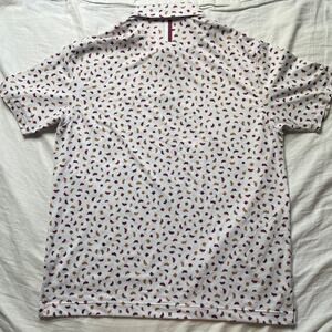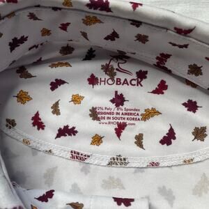 Rhoback short sleeve polo shirt, size large. Features an all over fall leaves print and a lightweight and breathable material. Good preowned condition, no notable flaws.
