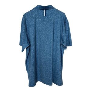 Keywords: Rhoback, men's polo, blue, geometric pattern, short sleeve, lightweight, breathable, golf, casual wear, regular fit, collared, polyester, spandex, 2XL, pre-owned.