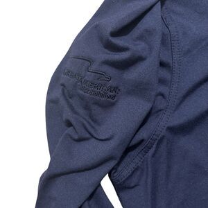 There is a company logo on the side on one sleeve as shown in the photos. The pullover is in excellent condition with no flaws.