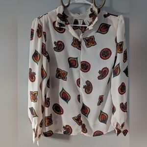 This stylish cream blouse showcases a buttoned design complemented by a charming Peter Pan collar. Crafted from a light, flowing fabric, it features subtle decorative motifs that enhance its elegant appeal. Ideal for adding a touch of sophistication to any outfit.