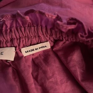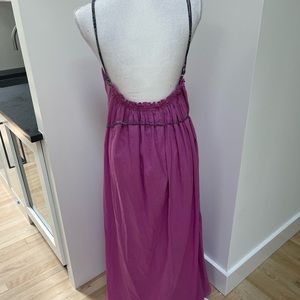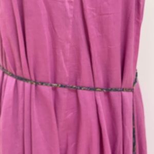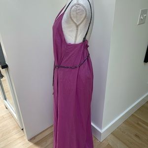 Shoulder to hem roughly 55. Armpit to armpit 17. Adjustable straps. The skinny taste belt and straps are in a beautiful fabric that has a look like Liberty. Color of dress is pinkish purple. Double lined to the thigh and than flows to hem. Worn a few times and in excellent condition l.