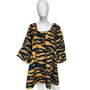 Rhode 'Alina' Gold Polyester Dress Size S: lightweight, non-stretch technical weave, tiger stripe pattern, scoop neck, pullover design, no closure, lined, puff sleeves.