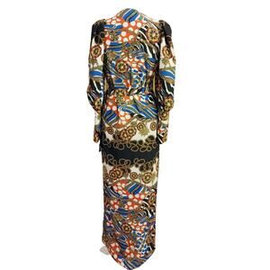 Rhode Aspen Scarf Print wrap midi dress. Puff sleeves with long zippered cuffs. Lightweight. Ties on side. Adjustable wrap fit. Scarf-print with medallions & chains printed in white, black, blue, red & gold.