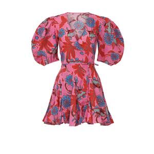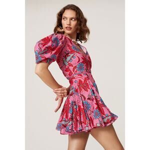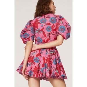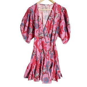 Rhode Claudine Pink Floral Print Puff Sleeve A-Line Wrap Mini Dress Size Large