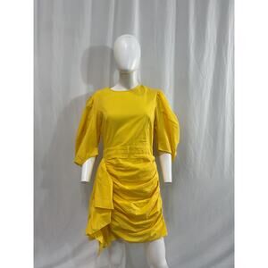 Rhode 'Pia' Yellow Dress Size M: partially lined, hidden back zipper closure, draped puff sleeves, ruched skirt with draped accent fabric.