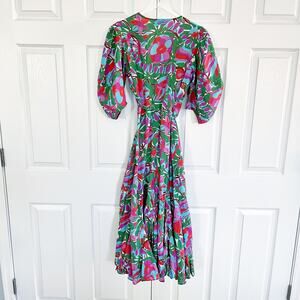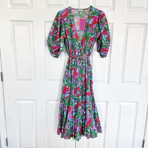 Wrap dress featuring a crossover neckline and flattering side tie, the bodice descends into a full skirt with pleats. Puffed sleeves finish it with feminine allure. In a 60s-inspired Wight Fleur Tropicale print. Unlined.