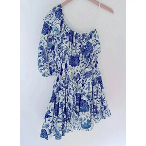 A ruffled asymmetric neck elevates RHODE's Ozzie ornate cotton dress, featuring a single-puff sleeve and braided tie-waist.