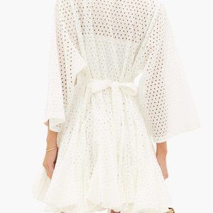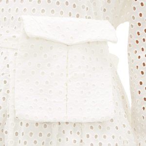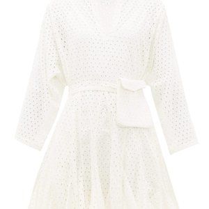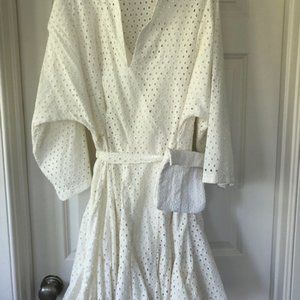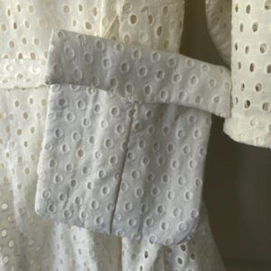Size M, Ivory Broderie-Anglaise, 100% Cotton Voile. Mini, fluted skirt twirls beautifully with godet inserts. Coordinating slip dress underneath. Detachable fabric belt with waist pouch. V-neck slit. Hand wash. This item is new, never worn. No marks. In pristine condition. Length 35", shoulder width 15.8", waist 46.5", sleeve length 27.6".