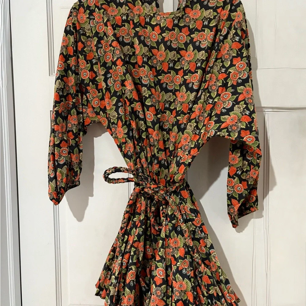 Elegant women's dress featuring a vibrant floral pattern. The black and orange colors create a striking look, perfect for any occasion.