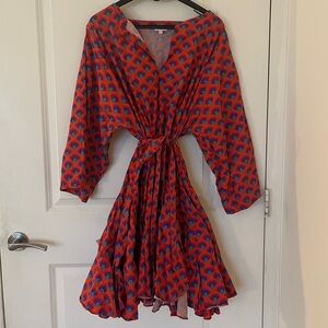 RHODE Resort’s red print ‘Ryan’ mini dress showcases the label's bohemian tone through the multicolored fan-style rainbow print and voluminous silhouette. It's crafted from soft cotton with a slit neckline, wide sleeves and a darling ruffled, asymmetric hem. Team it with neutral accessories for your next warm-weather vacation. Belt bag pouch not included.