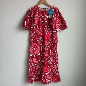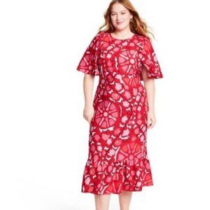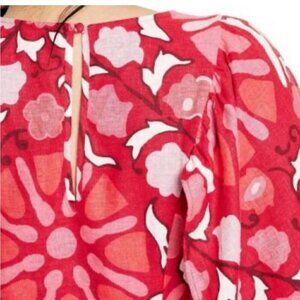 Adorned with allover large zinnia print in red and pink, this midi dress is designed with a high neckline, a keyhole back with button closure, short bell sleeves, and a ruffled hemline. It has a flowy drape and is made of lightweight, breathable linen-blend fabric for comfortable wear.