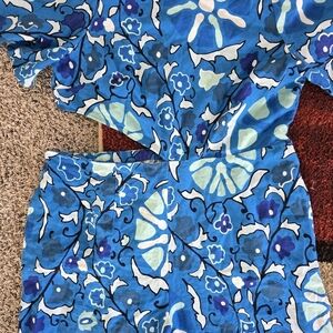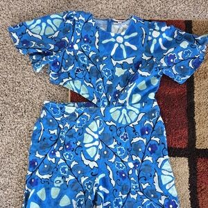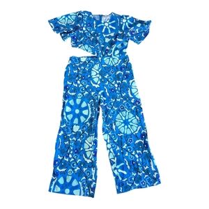 This Rhode X Target jumpsuit in size 1X features a beautiful blue floral pattern with white accents, perfect for various occasions like travel, weddings, parties, or casual wear. The jumpsuit has short bell sleeves and is made of a comfortable viscose and linen blend fabric. Designed with a colorful and stylish flair, this one-piece outfit also includes convenient pockets for added functionality. Perfect for women looking for a fashionable and versatile addition to their wardrobe.