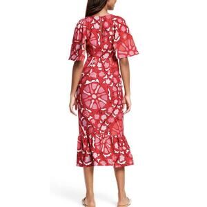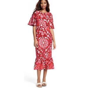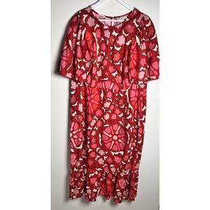 The Rhode X Target Plus Size 22 Zinnia Floral Bell Sleeve Linen Blend MIDI Dress is a stylish and vibrant dress perfect for a party or cocktail event. Made from a lightweight rayon and linen blend, this dress features a beautiful floral pattern in red and pink, with a flattering fit and flare style. The bell sleeves, ruffle accents, and button detailing add a touch of elegance, while the zip closure and machine washable fabric make it easy to wear and care for. Perfect for summer, fall, or spring, this dress is a must-have for any fashion-forward woman looking to make a statement.