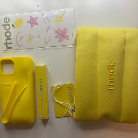 Brand New, Never Used Limited Edition Yellow Rhode Set, iPhone 14 Case, Lemontini Lip Peptide, Makeup Bag