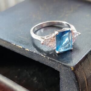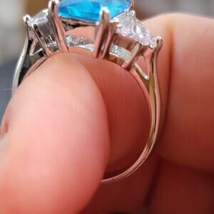 This ring, crafted with rhodium plating, features a stunning simulated blue topaz at its center, complemented by two triangular simulated diamonds. The combination creates a harmonious and eye-catching design, perfect for making a statement.