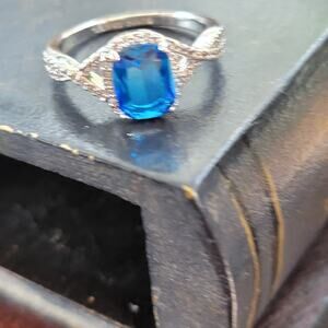 Rhodium Plated Simulated Sapphire Ring - Size 9 - Exquisite Crossover Design
