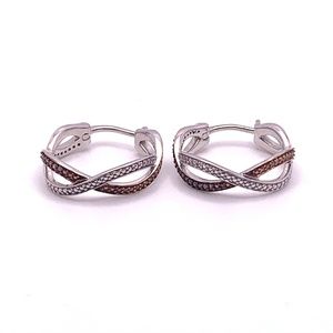 Item Description: Rhodium two-tone swirl hoop earrings Bronze and White 1/8 tcw diamonds. Item is new without tags, never been worn. Shipped with USPS Priority within 1-3 business days.