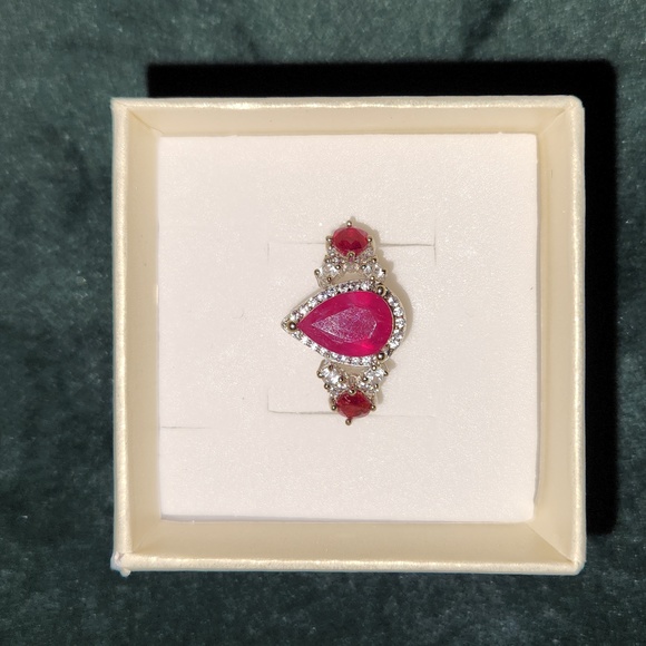 Pear shape rhodolite, solitaire rubies, cz, on sterling silver band. You can see the natural inclusions within the rhodolite and ruby stones in person.